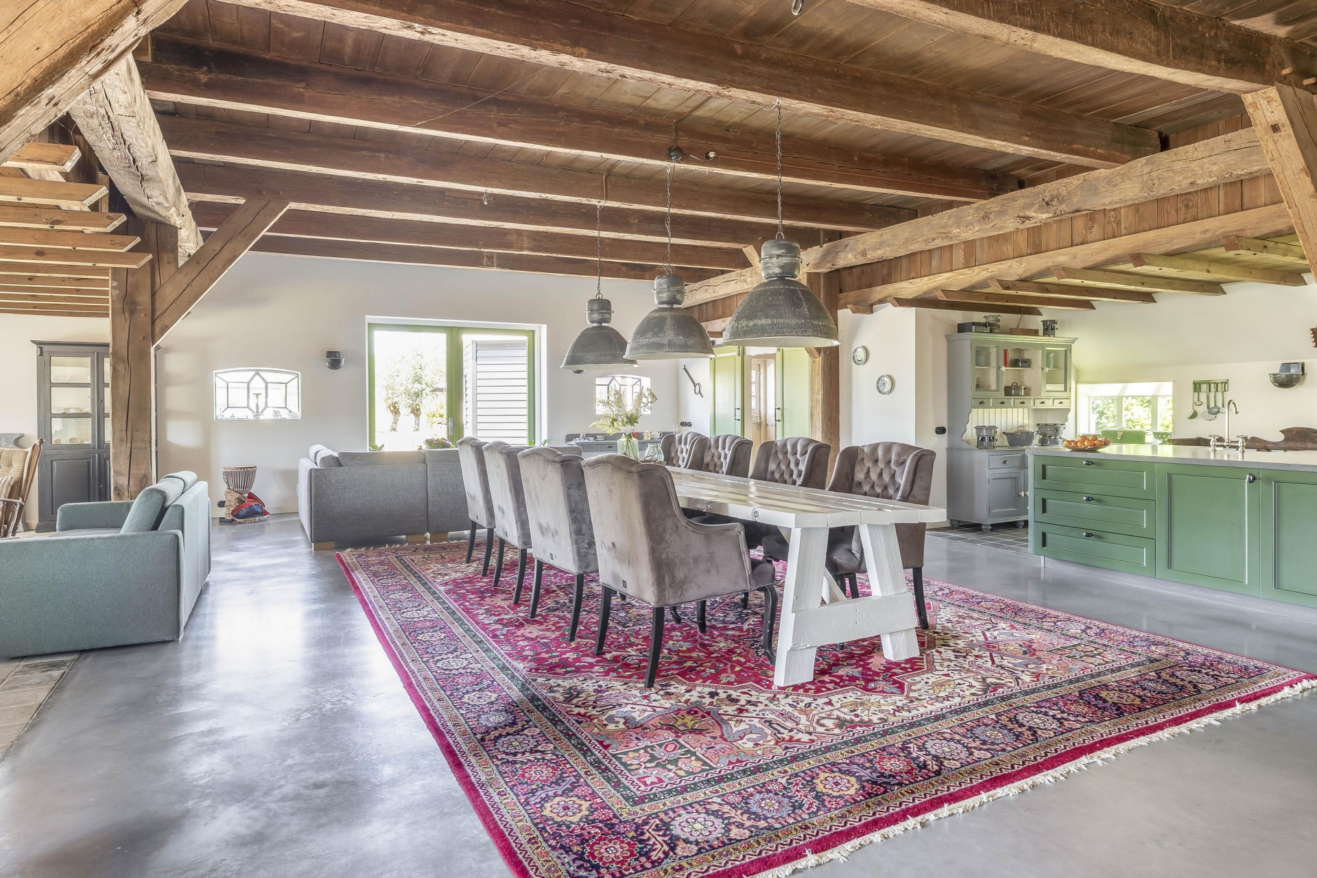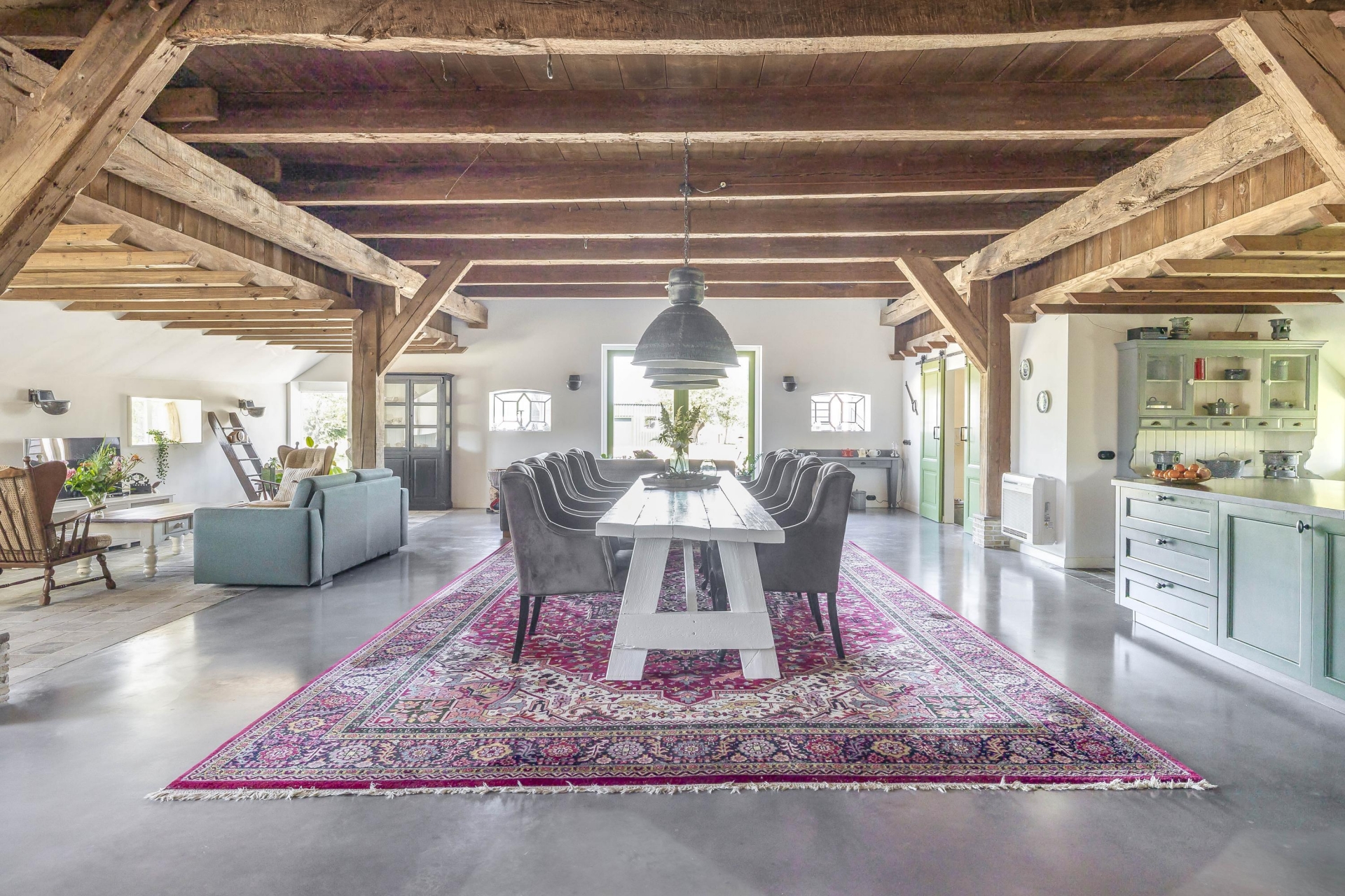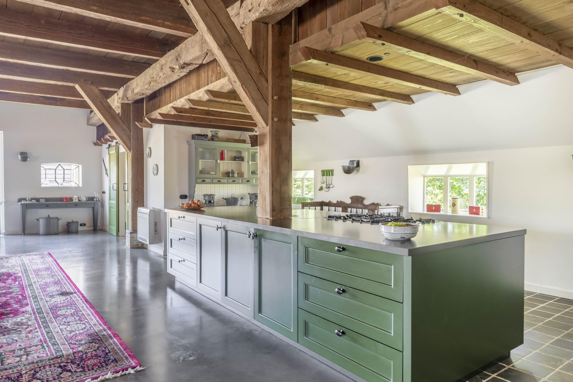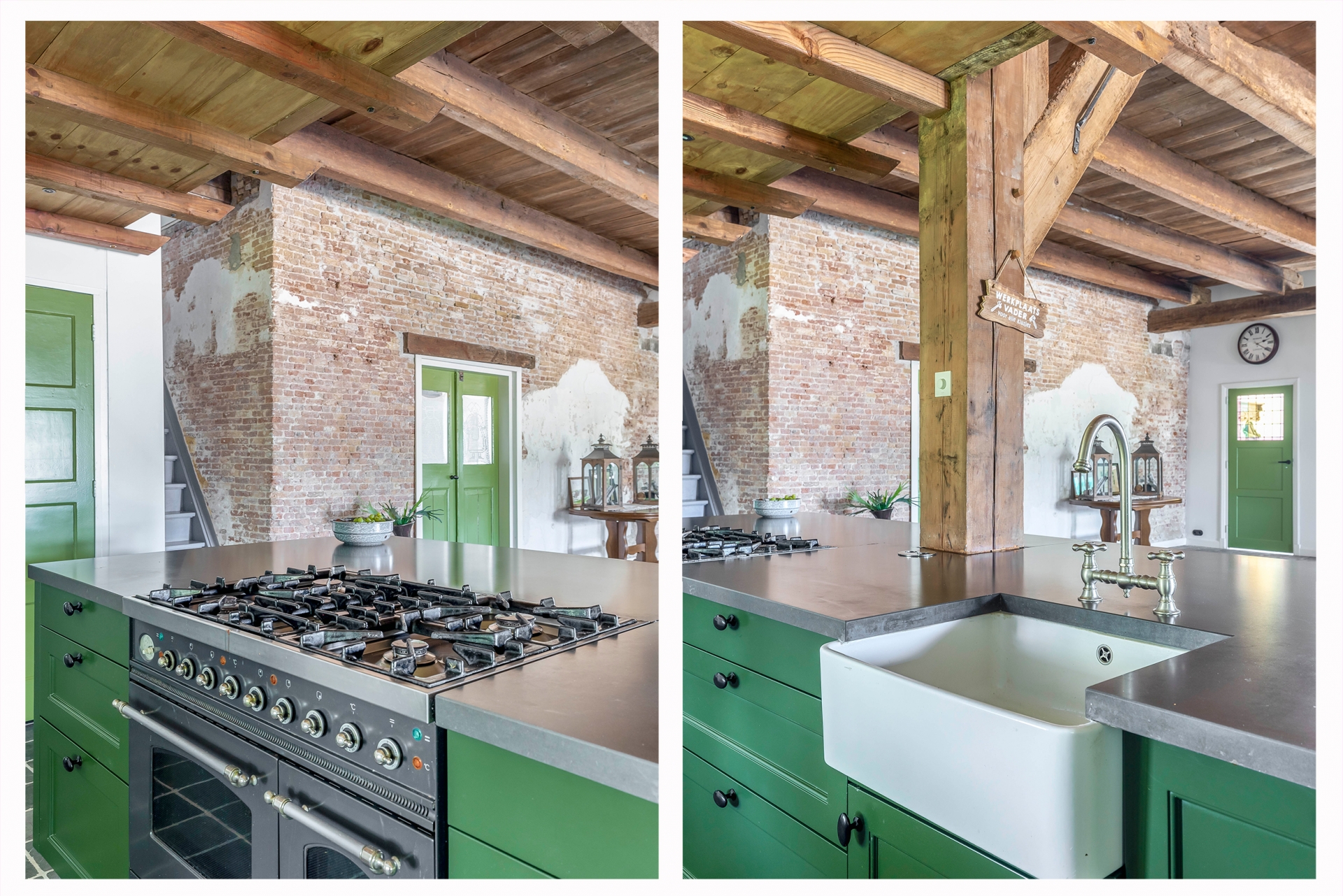 De boerderij stamt uit de 17e eeuw en is volledig gerenoveerd met oog voor stijl én comfort. De rieten kap, luiken, originele houten balken en de karakteristieke indeling ademen historie, terwijl de afwerking juist eigentijds is. De royale woonkeuken in het hart van het huis is een absolute blikvanger: een combinatie van landelijke charme en hedendaags gemak. Denk aan een groot fornuis, veel werkruimte en directe toegang tot de tuin – koken en leven vloeien hier moeiteloos in elkaar over.