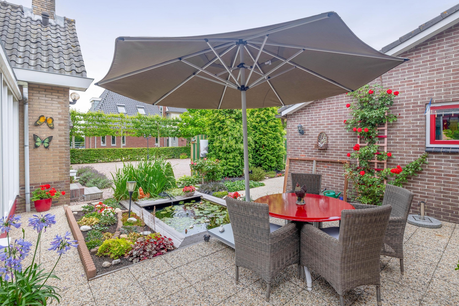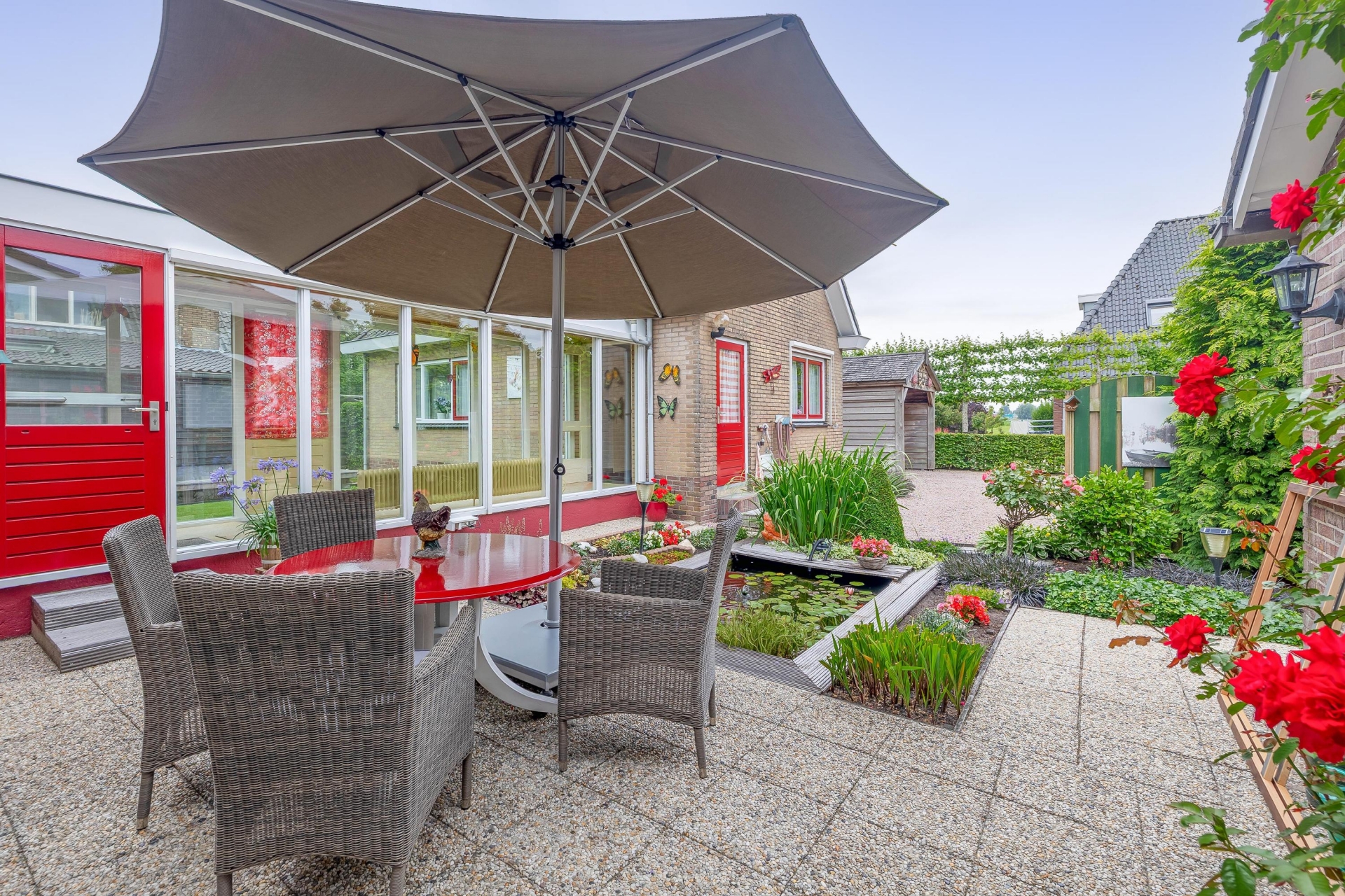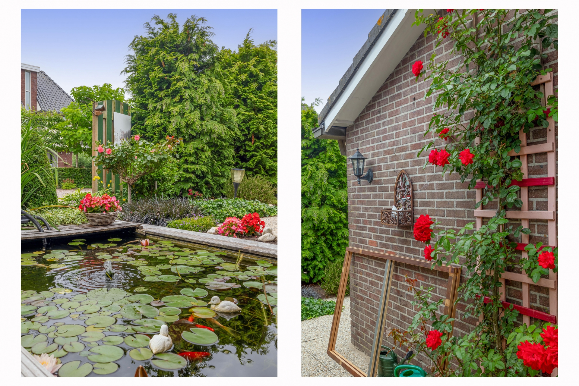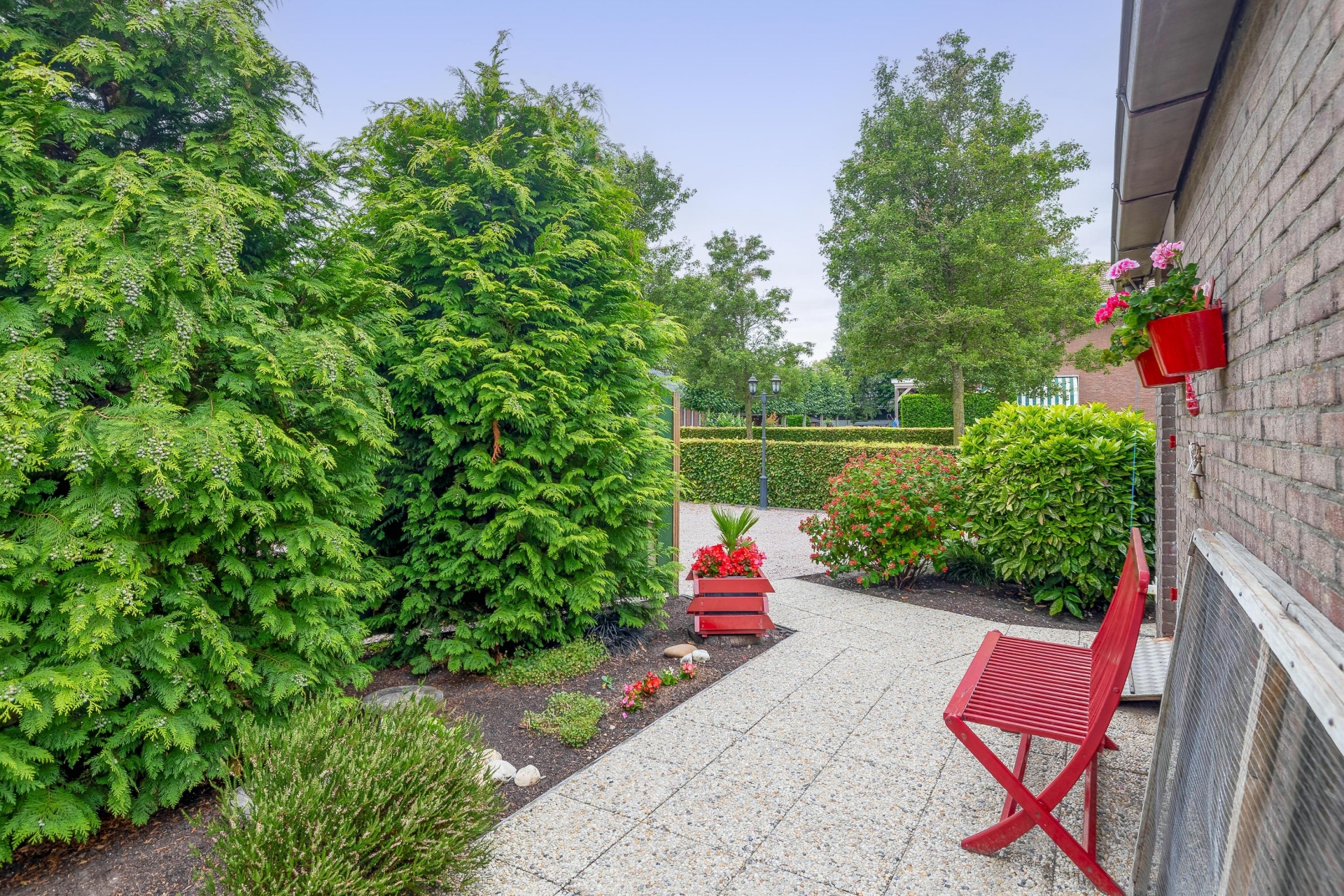 De rondom gelegen tuin is met zorg aangelegd en biedt een mooie balans tussen zon en schaduw dankzij de ligging op het noorden, westen én zuiden. Meerdere terrassen en groene borders zorgen voor een fijne buitenbeleving met volop privacy. Naast een garage is er ook een carport aanwezig.