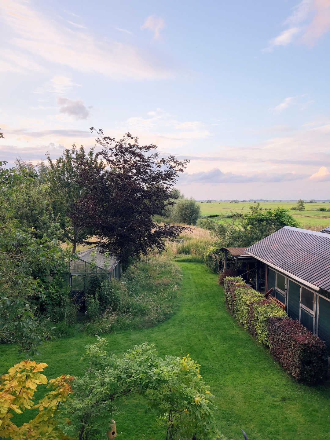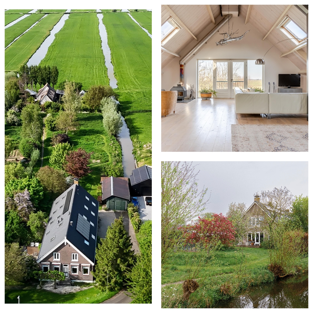 De grote open ruimte op de bovenverdieping met hoge nok, zichtbare balken, houten vloer en grote dakramen zorgt voor een bijzondere sfeer. De ruime living op deze verdieping biedt een fantastisch uitzicht over de omliggende polder – een rustgevend panorama dat ieder moment van de dag een andere sfeer heeft. De openslaande deuren versterken het gevoel van verbinding met buiten. De ruimte wordt nu gebruikt als tweede woonkamer, maar leent zich ook voor andere invullingen zoals een atelier of fotostudio.