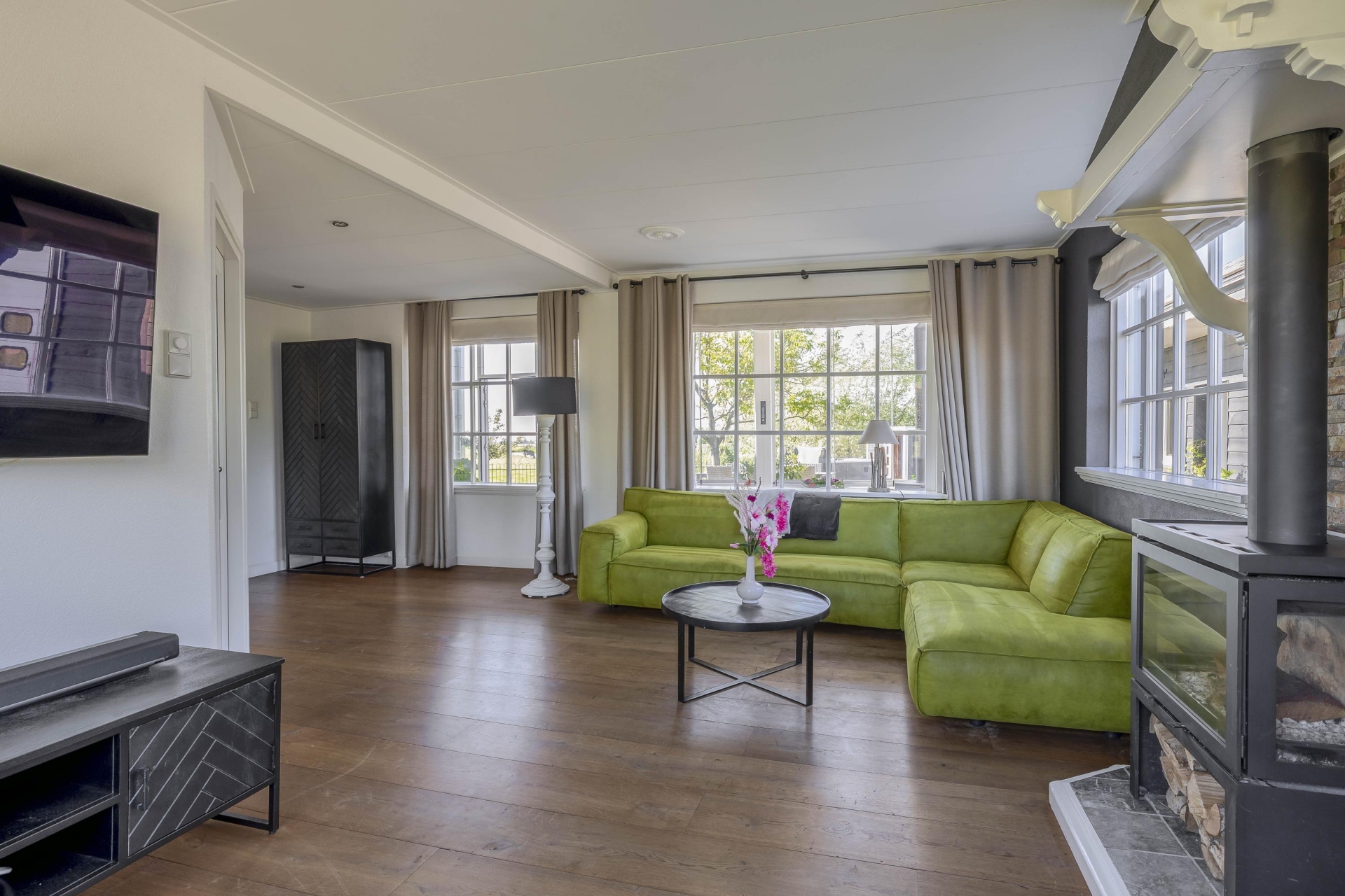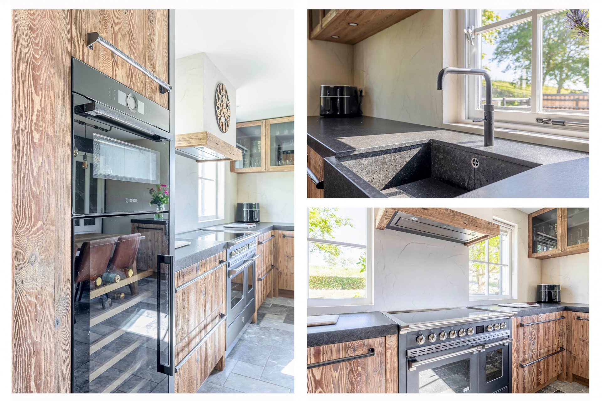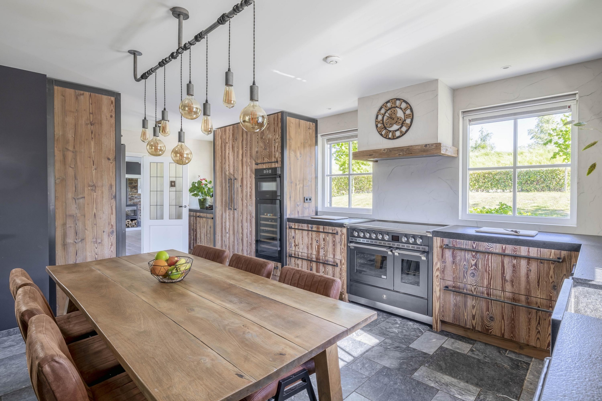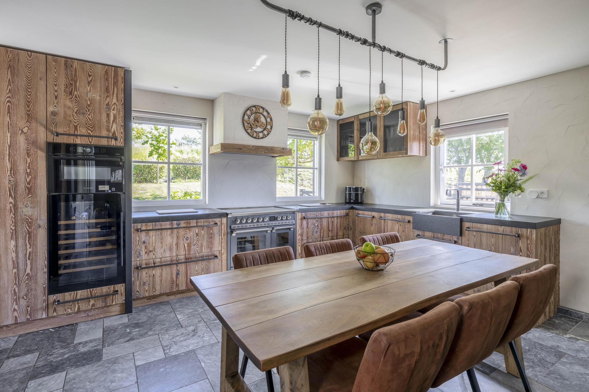 Binnen treft u een warme, eigentijdse afwerking met eikenhouten vloeren, zachte natuurtinten en veel lichtinval. De luxe woonkeuken (2023) is een echte blikvanger: uitgevoerd in barnwood, voorzien van een Quooker, Steel Ascott fornuis en hoogwaardige apparatuur van Bosch.