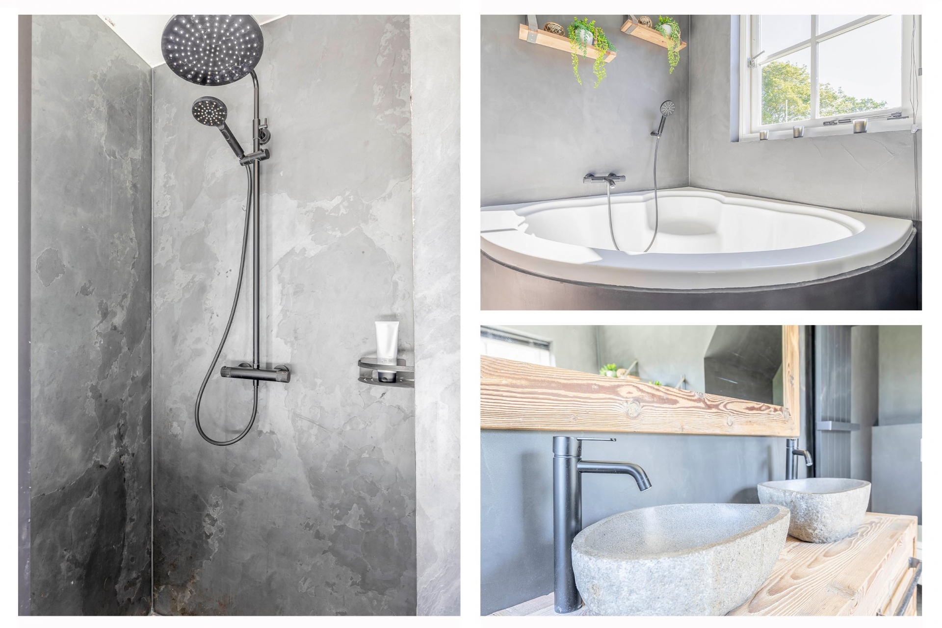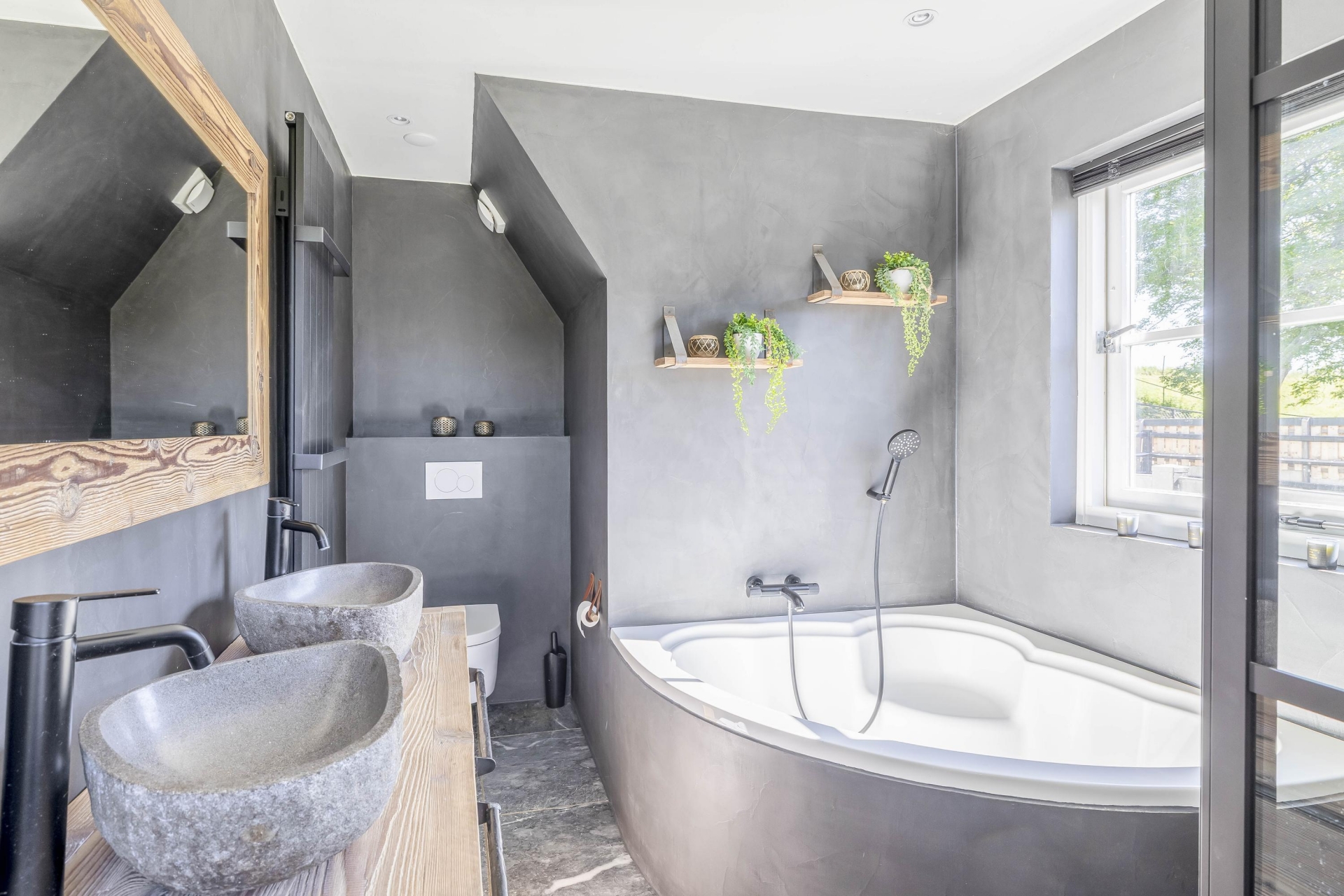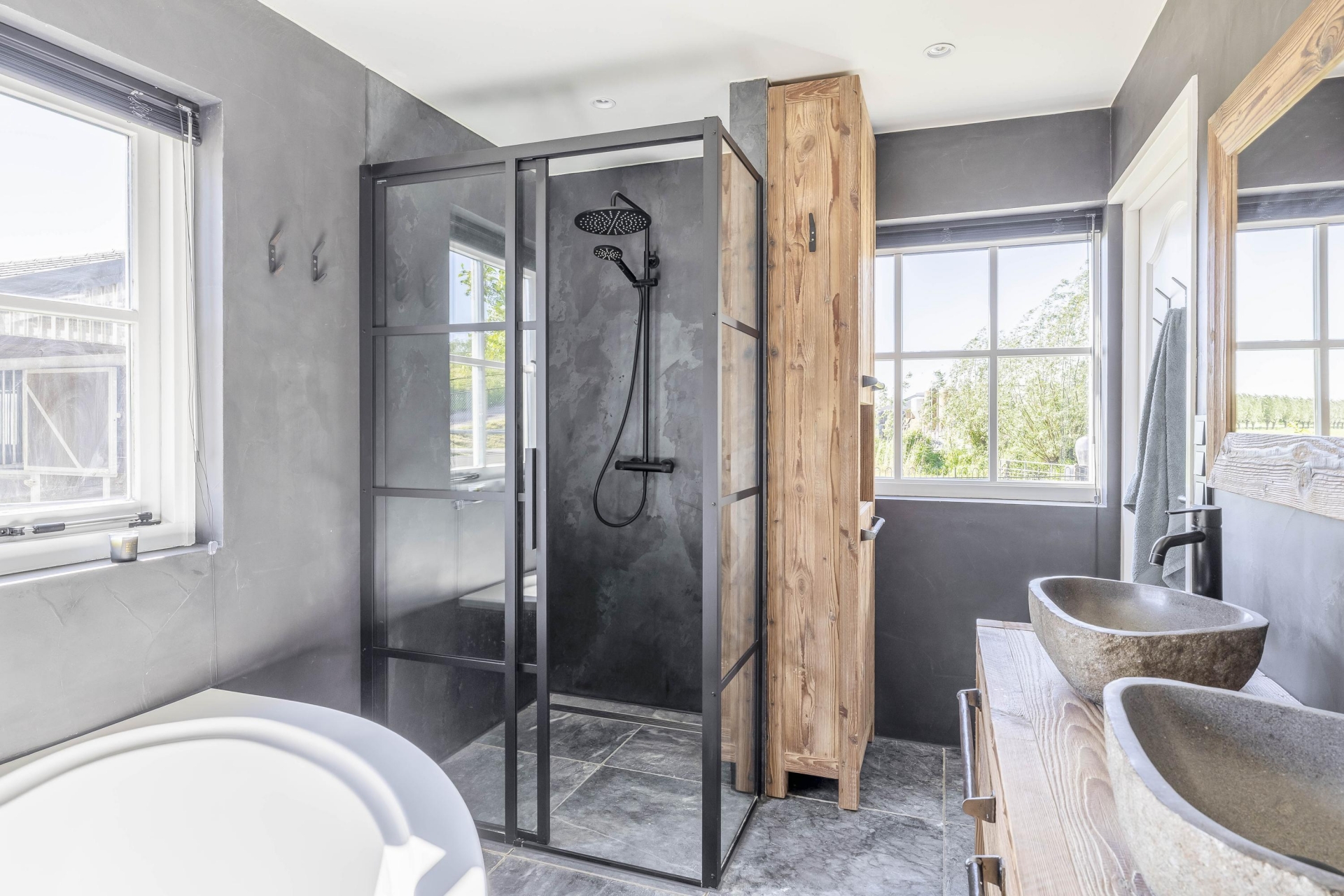 De woning telt vijf slaapkamers, twee badkamers (waarvan één nieuw in 2023), en een extra herentoilet beneden. De nieuwe badkamer is uitgevoerd in dezelfde natuurlijke stijl, met ligbad, inloopdouche en barnwood meubels.