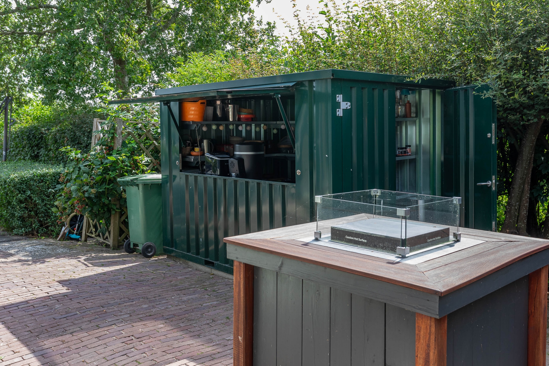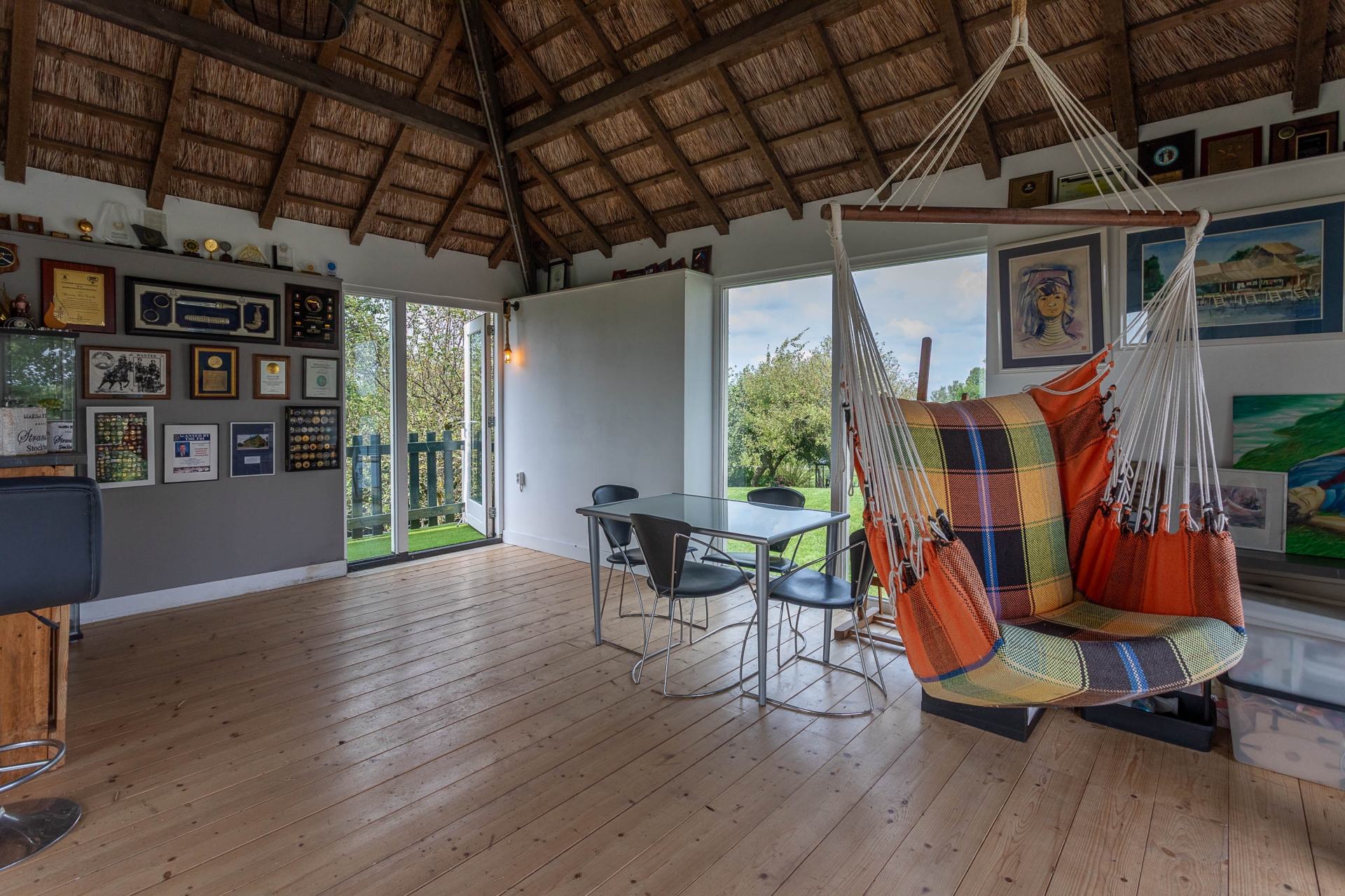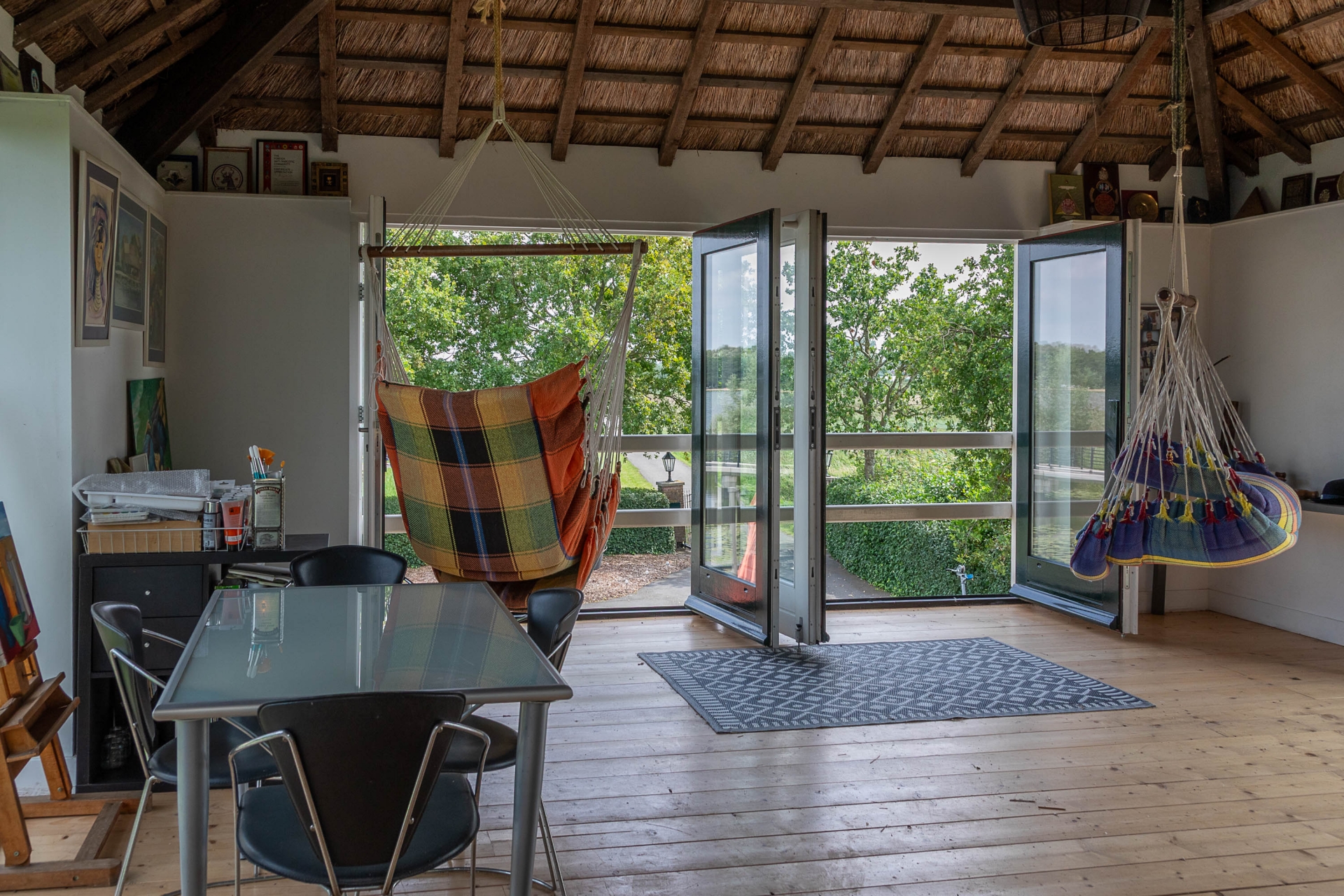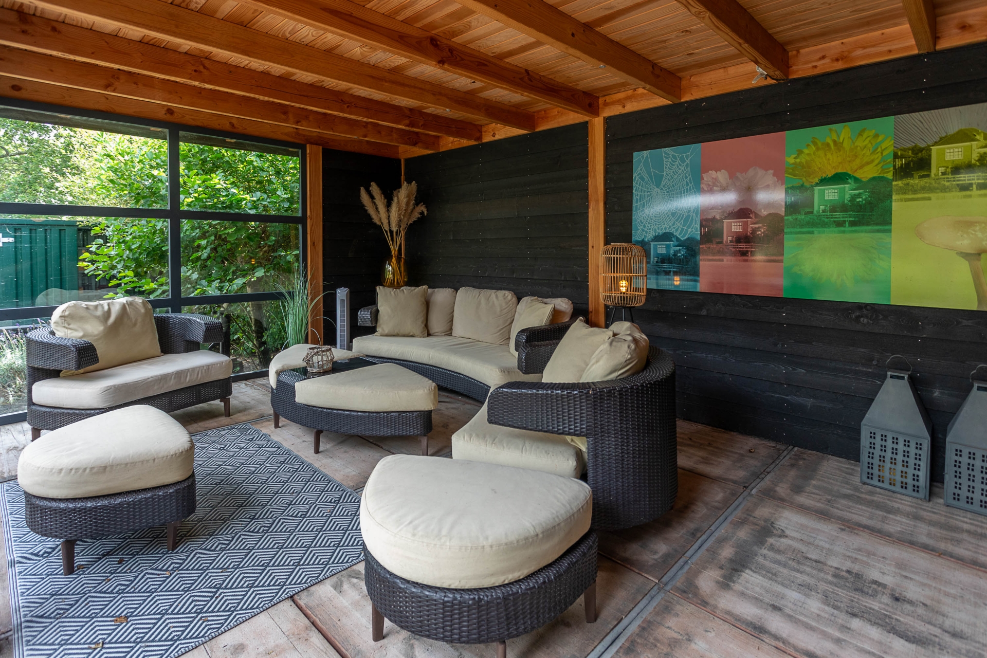 De lounge in het tuinhuis, de cocktailbar voor feestelijke avonden, de hangmatten op zolder met 360 graden uitzicht, en de dubbele garage — alles ademt comfort en buitenleven.