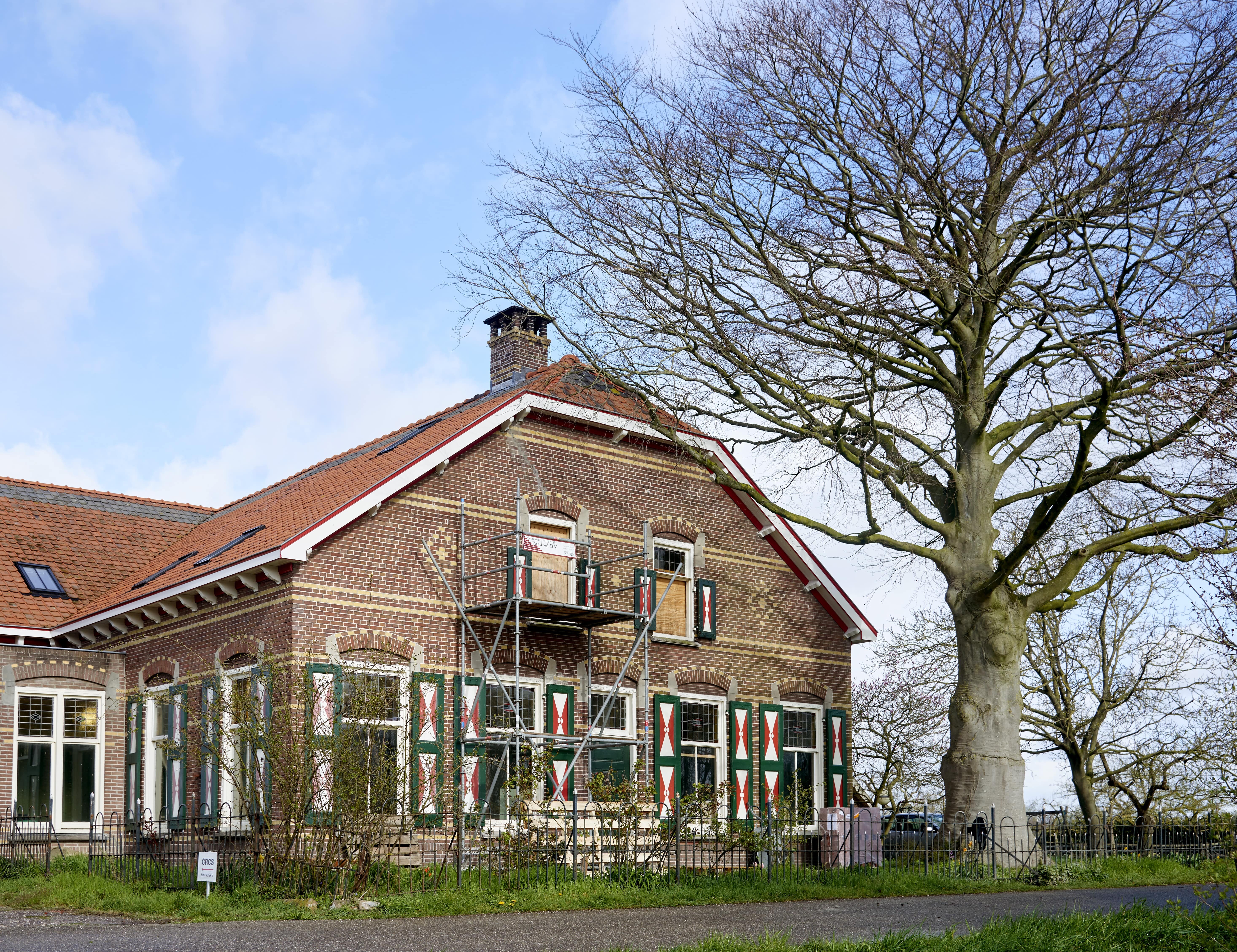 Aan het brede L-vormige woonhuis zitten nog twee gebouwen. Een kaasmakerij en hooitas. Met daar weer achter twee langgerekte stallen van elk 325 meter. Ook hier fraai metselwerk en originele ramen. Verder op het erf een forse opslagschuur, bakhuis, werktuigberging, ligboxenstal -die ging tegen de vlakte, want geen monumentale waarde- en open houten kapschuur waar ooit 40 koeienstonden te grazen. Nu huppelen er kippen over het erf, en die hebben het - getuige hun gekakel - flink naar de zin. Ernest: “Het enige probleem is dat er af en toe een vos rondloopt. Maar dat lossen ze zelf goed op, merk ik.”