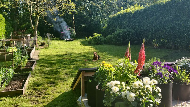 Marisa: ‘Schoenen uit, lekker met je blote voeten in het gras. Wij waren altijd aan het scharrelen rondom het huisje, bezig in de moestuin, aan het zagen. De hangmat werd alleen gebuikt door onze gasten. Bij het huisje hoort een eigen bruggetje en zodra we daar overheen liepen, kwamen we een andere wereld binnen. Zelfs onze hond werd rustiger op De Loet.’