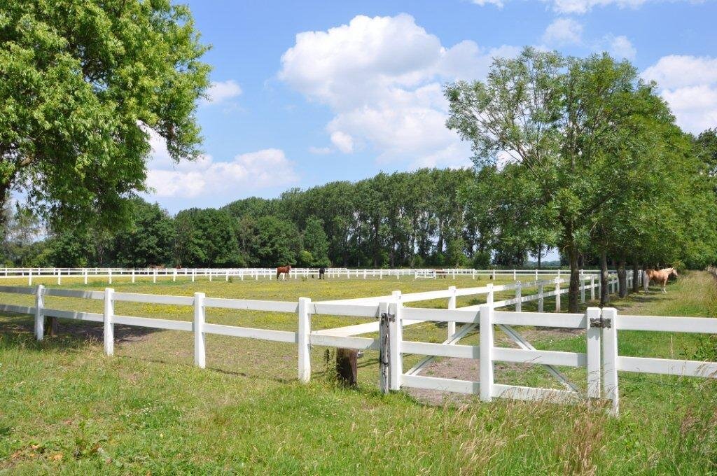 Het weiland ligt achter het complex en is met witte kunststof hekken omzoomd.